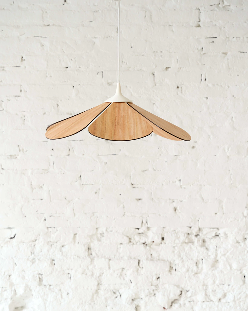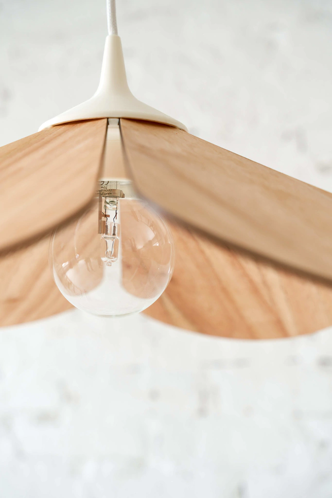 Lámpara colgante de diseño fabricada en madera MDF enchapada en paraíso. Capuchón con color a elección.