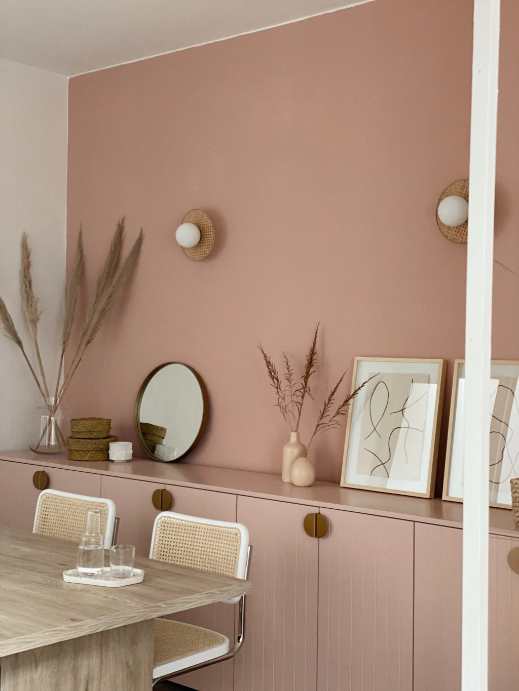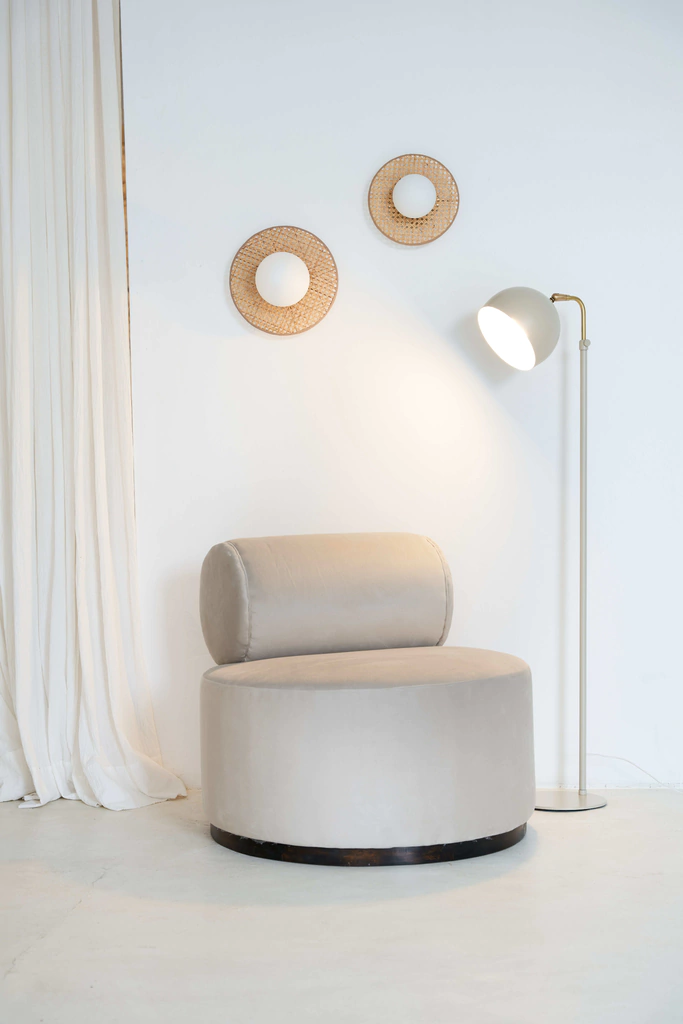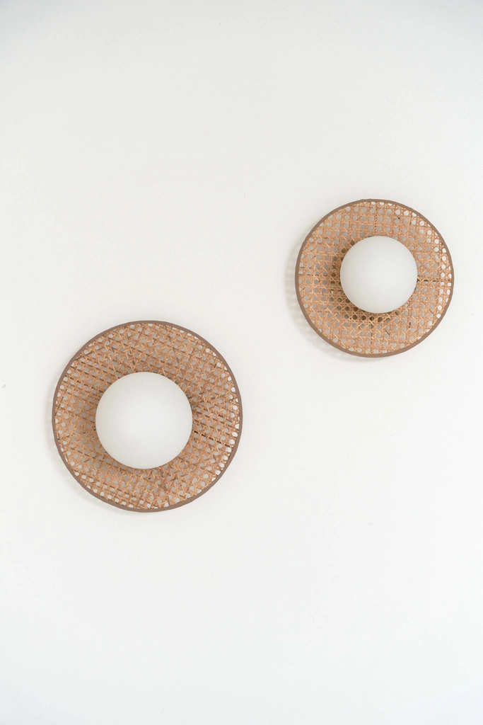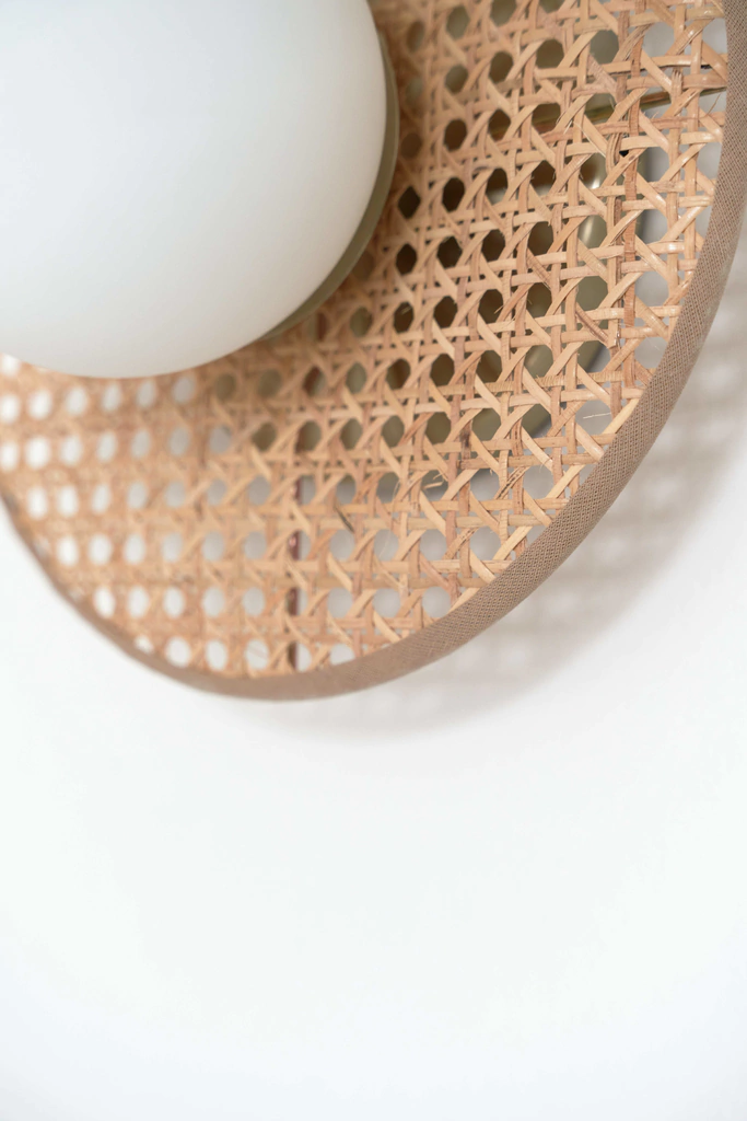 Aplique de pared o techo compuesto por pieza metálica a pared + aro en tejido de esterilla + tulipa de vidrio.