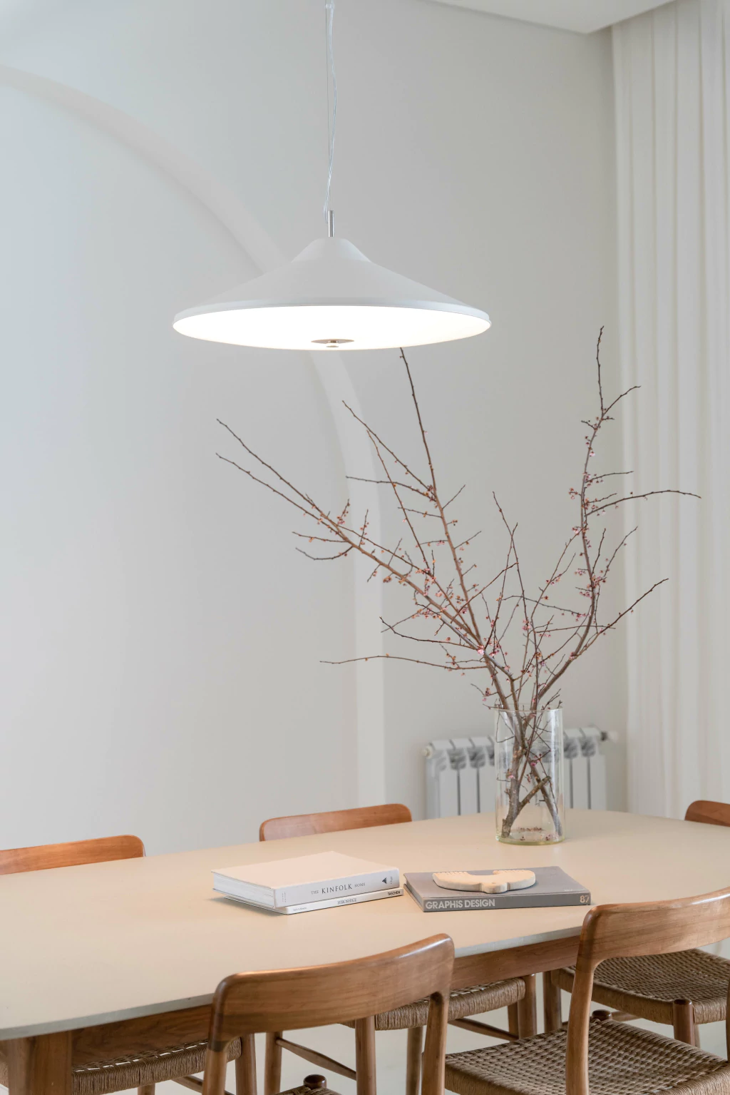 Lámpara de suspensión, luz directa. Difusor de acrilico blanco satinado. Cable de suspensión en acero revestido en nylon y cable transparente.