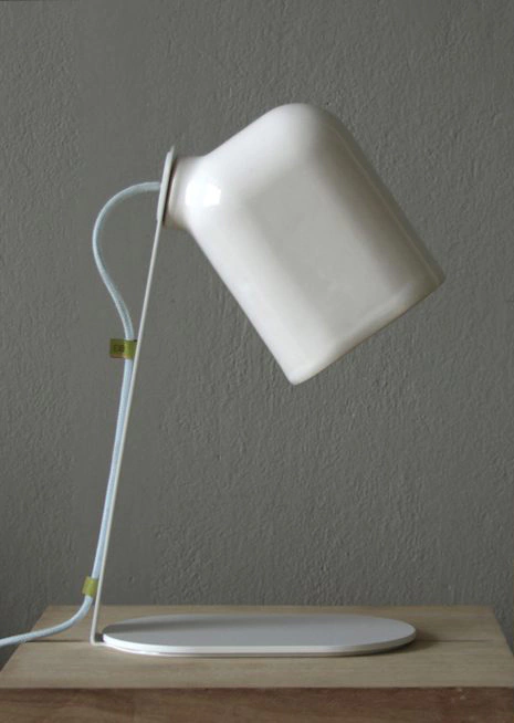 Lámpara de mesa realizada en cerámica esmaltada blanca con estructura de hierro. Pintado al horno y madera.