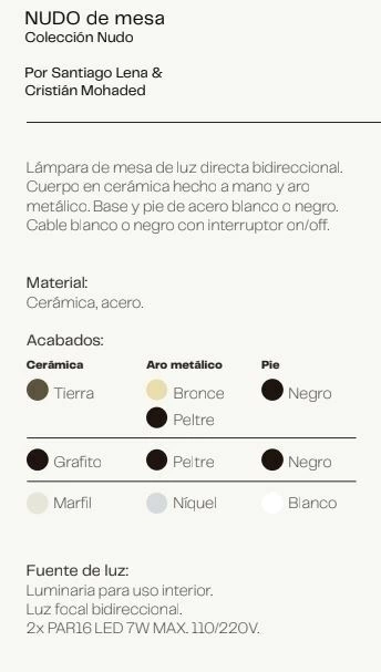 Lámpara de mesa de luz directa bidireccional. Cuerpo en cerámica hecho a mano y aro metálico. Base y pie de acero. Cable con interruptor on/off.