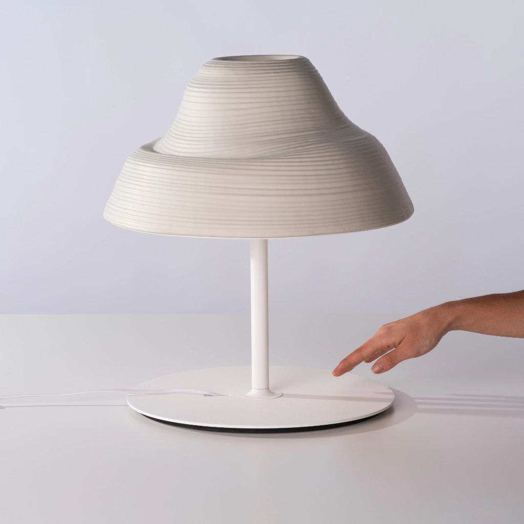 Lámpara de mesa de luz semi directa. Cuerpo en cerámica, aluminio y acero. Difusor de metacrilato esmerilado.