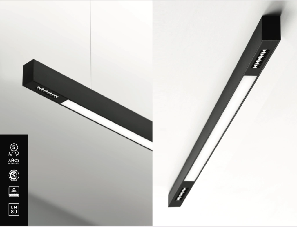 Artefacto de iluminación para suspender o para aplicar en techo. Cuerpo de aluminio y reflector de policarbonato.